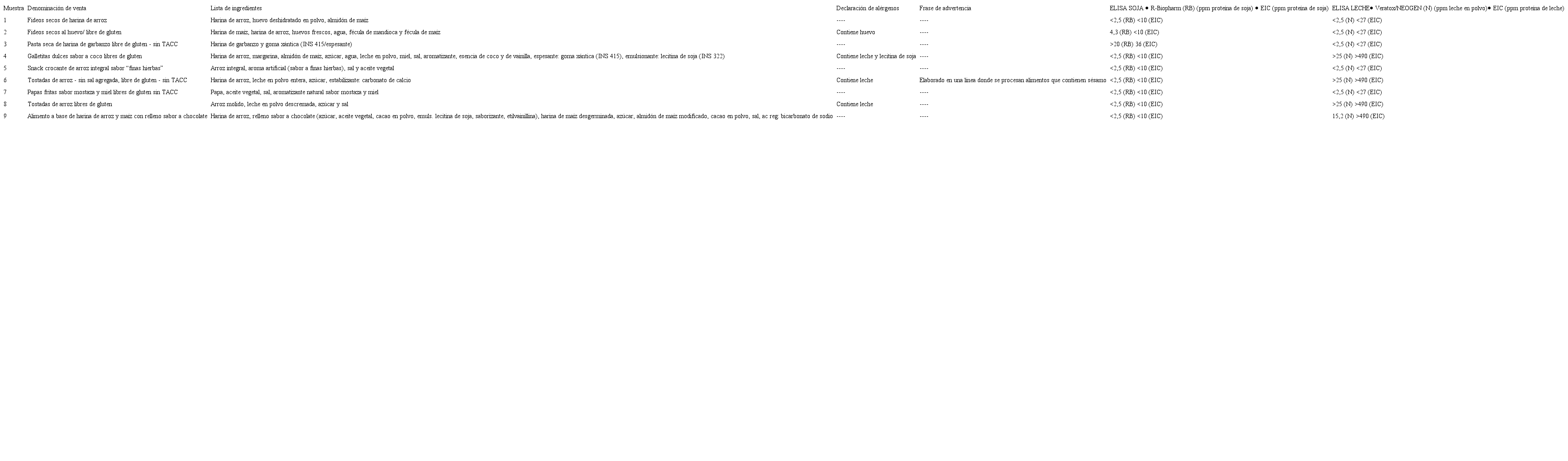Se estudiaron 9 productos libres de gluten. La descripción de cada muestra y la lista de ingredientes de cada una de ellas se encuentran detalladas en la Tabla I. Todas las muestras fueron analizadas por duplicado.