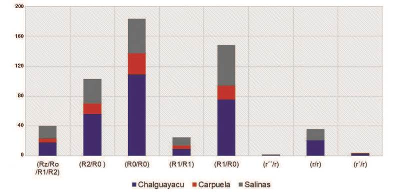 Se identificaron cinco combinaciones fenotípicas; la más frecuente fue ce (R0/R0) 33,83%, seguida de Ce (R1/R0). Para RhD (negativo) el de mayor frecuencia fue el fenotipo ce (r/r) con el 85,70% y los de menor frecuencia fueron: el fenotipo Ce (rʹ/r) con el 9,50%, seguido del fenotipo cEe (rʹʹ/r) con el 4,80%. Las dos muestras tipificadas como D débiles presentaron el fenotipo R0/r (Tabla IV). Los fenotipos identificados se encontraban distribuidos en los tres servicios de salud. El ce (R0/R0) fue el más frecuente en Chalguayacu y Carpuela y el Cce (R1/R0) en Salinas (Fig. 1). En relación con el género, en hombres el fenotipo Cce (R1/R0) tuvo una mayor frecuencia (36,53%), seguido de ce (R0/R0) 34,62%. En las mujeres el ce (R0/R0) fue el más prevalente, pero también se observó la presencia de los fenotipos Cce (R1/R0) y cEe (R2/R0).