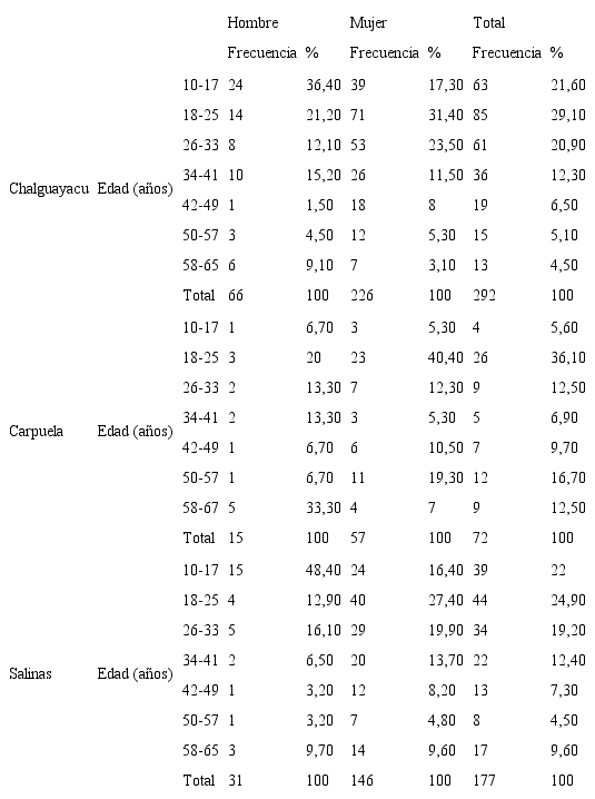 Se realizó un estudio descriptivo, transversal con muestreo aleatorio simple en el Valle del Chota. Se partió de una población finita de 4361 pobladores afroecuatorianos habitantes de la zona y que concurrían a los centros de salud tipo A1 (Salinas), al Centro de Salud Carpuela y al puesto de Salud Chalguayacu. El tamaño muestral se determinó al aplicar la fórmula de población finita; se contó para el estudio con un total de 541 individuos conformados por 429 mujeres (79,3%) y 112 hombres (20,7%) con edades comprendidas entre 10 y 65 años. En Chalguayacu, de las 226 mujeres que acudieron, el 31,40% tenían entre 18 y 25 años, cifras similares a las de Carpuela y Salinas. También se observó en Chalguayacu la presencia de hombres de 10 a 17 años, mientras que en Carpuela la edad del género masculino osciló entre 58 y 65 años (Tabla I).