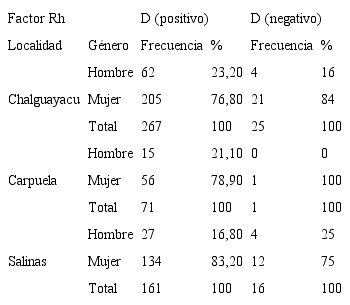 Se determinó que el 92% de la población presentaba una reacción positiva con la metodología en tubo, que inicialmente fue clasificada como D (positiva). El análisis de la distribución del antígeno D en relación con la procedencia y género determinó que en Chalguayacu era predominante el factor RhD positivo, tanto en hombres como en mujeres; en Carpuela no existieron hombres tipificados como D negativo; mientras que en Salinas el 75% (n=12) de las mujeres fueron tipificadas como D negativo (Tabla II).