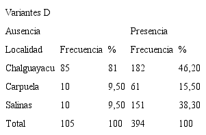 El 79% de los individuos presentaban reacciones serológicas <2 y 3(+), indicativas de la presencia de variantes de D y el 21% reactividad de 4(+) catalogadas como D positivas, de acuerdo con el inserto de reactivo IDDiaClon Anti-D de BIO-RAD. La localidad que presentó un mayor porcentaje de variantes de D fue Chalguayacu (46,20%), seguida de Salinas con el 38,30% y, por último Carpuela, con el 15,50% (Tabla III).