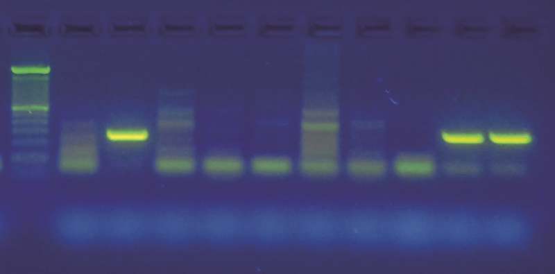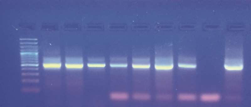 La electroforesis se realizó en geles de agarosa (Invitrogen, CA, EE.UU.) al 2% utilizando buffer TAE (tampón tris acetato 40 mM, EDTA 0,5 M pH 8,0) y un sistema de electroforesis horizontal (Bio Rad, Sub Cell GT, CA, EE.UU.). Se empleó un voltaje de 90 V durante 45 min. Los geles se tiñeron con SYBR Safe DNA gel stain (Invitrogen, CA, EE.UU.). Las bandas de ADN se visualizaron con un transiluminador de luz ultravioleta (UV Transilluminator UVP). El tamaño de las bandas de ADN se estimó comparándolas con un marcador de peso molecular de 100 pb (Invitrogen, CA, EE.UU.).