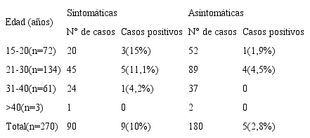 El promedio de edad de las pacientes fue de 25,4 años ±6,6 (15-42). De las 270 pacientes, 90 (33,3%) presentaban algún síntoma urogenital (flujo, ardor, olor, prurito) y el resto eran asintomáticas (n=180). La prevalencia según síntomas y rango etario se detalla en la Tabla I. No se detectaron casos de coinfección con N. gonorrhoeae ni con T. vaginalis. En el 1,5% (4/270) se determinó coinfección con C. trachomatis (Fig. 2).