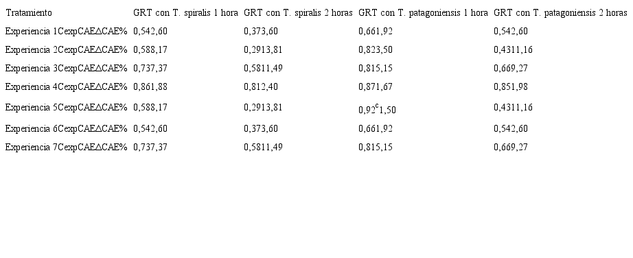 Los valores de la media y la desviación estándar de los CexpCAE mostraron, para ambas especies, que el aumento del tiempo de tratamiento producía mayor disminución de carga globular, así como también que, a los dos tiempos de incubación estudiados, T. spiralis provocaba mayor alteración que T. patagoniensis. Estos resultados fueron similares a los comunicados previamente aplicando el método de Polibrene (15).