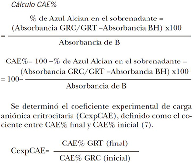 La absorbancia del blanco de Azul Alcian corresponde a 100%. La absorbancia medida en el sobrenadante del tubo en el que se coloca la muestra de eritrocitos corresponde al colorante que no se ha unido a los glóbulos. La medición de absorbancia del Azul Alcian que permanece libre es referida a la del blanco para calcular el porcentaje que representa. Por diferencia con el 100%, se determina el porcentaje de colorante unido al ácido siálico de la muestra, que se denomina CAE% (carga aniónica eritrocitaria porcentual). Debido a que el colorante se disuelve en alcohol y produce hemólisis globular, se debe preparar un blanco de hemólisis cuyo valor de absorbancia se resta al de la muestra con eritrocitos.