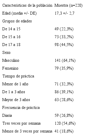 Al analizar las características sociodemográficas de los deportistas incluidos en la investigación se obtuvo un promedio de edad de 17,3 con una desviación estándar (DE) de 2,7 años, con predominio de adolescentes entre 17 y 18 años (98 deportistas que representaron el 44,6% del total de la muestra) (Tabla I). En relación al sexo existió predominio de deportistas masculinos (64,1%). El 39,1% de los deportistas llevaba entre 1 y 3 años dedicados a la práctica activa y regular del deporte y el 54,6% de ellos practicaban la actividad deportiva tres veces por semana.