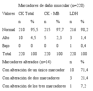 En relación a los resultados de la CK el 95,5% presentó valores normales y solo el 4,5% valores altos; respecto de la CK-MB, el 97,7% de los deportistas investigados tuvo valores normales y solo el 2,3% presentó valores altos. Se observó igualmente que un total de 10 deportistas presentaron alteraciones en un único marcador, 3 deportistas en 2 marcadores y en un único adolescente se evidenciaron alteraciones en los tres marcadores de daño muscular.