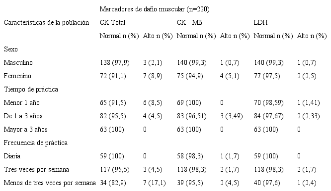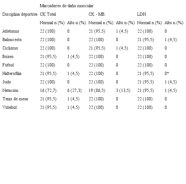 Se concluye que existió un predominio de deportistas masculinos, entre 17 y 18 años de edad, entre 1 y 3 años de práctica deportiva y que lo hacían con una frecuencia de tres veces por semana. La mayoría de los deportistas presentaron valores normales de marcadores de daño muscular y la CK total fue el marcador alterado en el mayor número de deportistas. La natación fue la disciplina con mayor número de atletas con elevación de los marcadores de daño muscular. El sexo femenino, la práctica de deporte por períodos menores de un año y con una frecuencia inferior a tres veces por semana fueron las características generales de los deportistas que no provocaron un aumento en los niveles séricos de CK total, CK-MB y LDH.