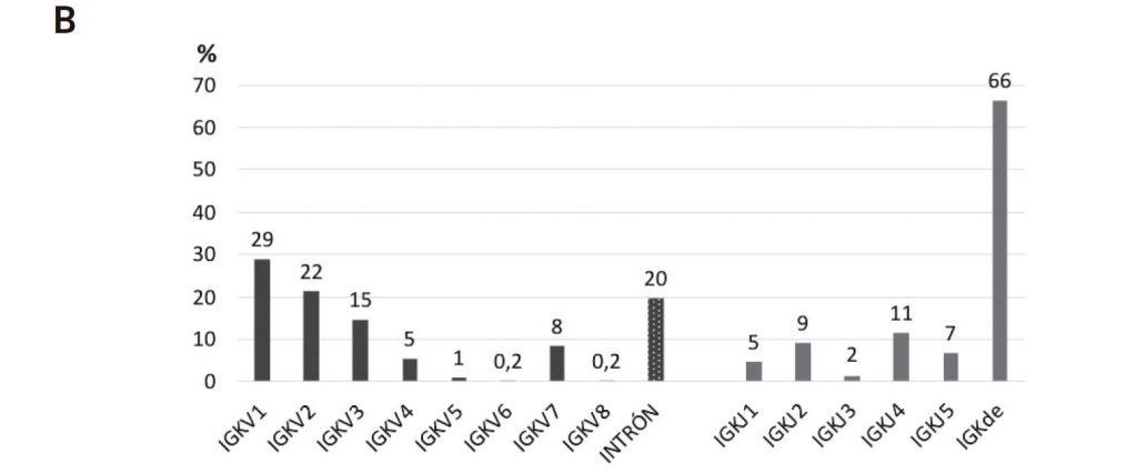 En cuanto a los reordenamientos en el locus IGK, los miembros de las familias Vk1 (29%), Vk2 (22%) y el reordenamiento que involucra la señal en el intrón (20%) fueron los más frecuentemente identificados, así como el elemento IGKde (66%) y las familias Jk4 (11%), y Jk2 (9%) (Fig. 2.B). Además, el segmento Jk4 se reordenó con mayor frecuencia con los segmentos Vk1 (47%), Vk2 (34%) y Vk3 (13%), cubriendo un 94% de los casos. Del total de 309 reordenamientos que involucraron al segmento IGKde, el 30% fueron intrón-Kde, el 22% Vk1-Kde y el 20% Vk2-Kde.
