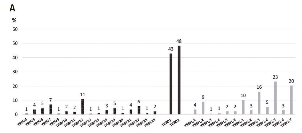 Cuando se analizaron los reordenamientos del locus TCRB, se observó que las recombinaciones de segmentos más frecuentes involucraron a los miembros de la familia Vb12 (11%), Vb7 (7%); y a los segmentos Jb2,3 (16%), Jb2,5 (23%) y Јb2,7 (20%). Los segmentos Db1 y Db2 estuvieron involucrados en los reordenamientos en similares proporciones (Fig. 3.A). Pudo observarse que los segmentos Јb caracterizados con mayor frecuencia (Jb2,3, Jb2,5 y Jb2,7), se reordenaron preferentemente con el segmento Db2 formando recombinaciones génicas incompletas.