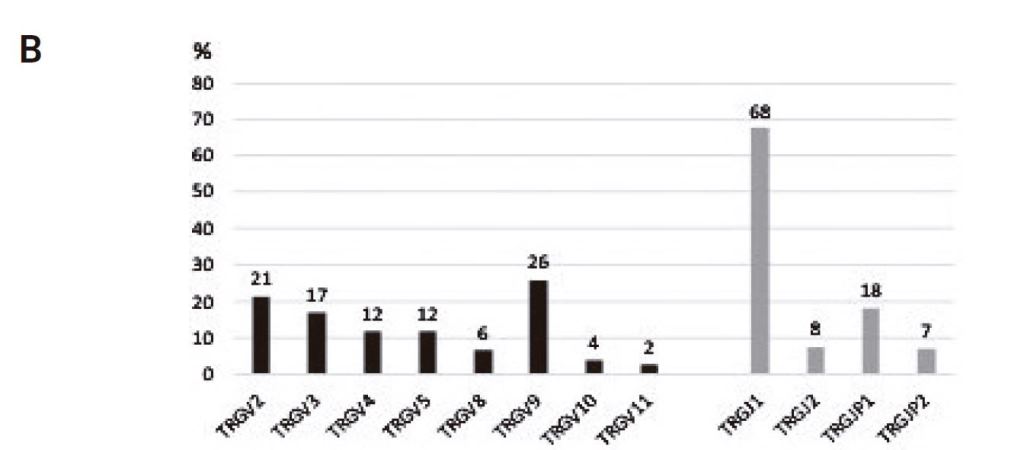 En el caso del locus TCRG, los reordenamientos más frecuentes fueron los que involucraron a los segmentos génicos Vg9 (26%), Vg2 (21%) y Vg3 (17%); y a las familias Jg1 (68%) y JPg1 (18%) (Fig. 3.B). Las recombinaciones génicas Vg2-Jg1 y Vg9-Jg1 fueron las más habitualmente halladas.
