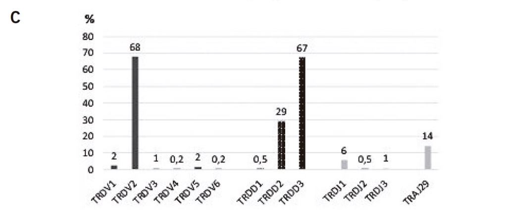 En el locus TCRD, se pudo observar que los reordenamientos que involucraron a los segmentos Vd2 (68%) y Dd3 (67%) fueron los más frecuentemente detectados (Fig. 3.C).