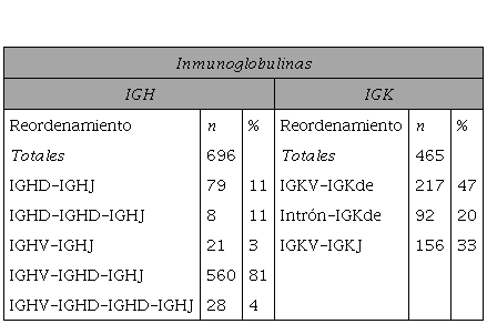Tabla II. Incidencia detallada de los diferentes reordenamientos génicos de inmunoglobulinas caracterizados.