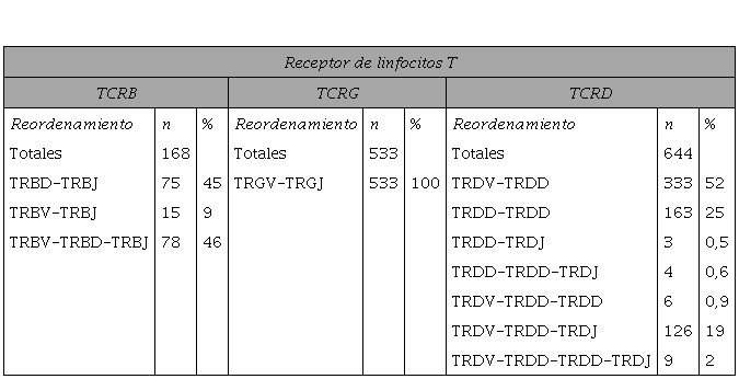 Tabla III. Incidencia detallada de los diferentes reordenamientos génicos del receptor de linfocitos T caracterizados.