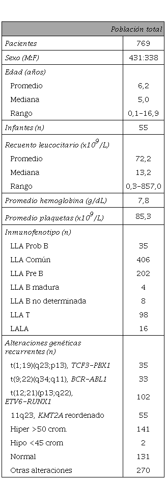 Las características clínicas, de laboratorio, de inmunofenotipo y las alteraciones genéticas de los 769 pacientes estudiados se muestran en la Tabla I.