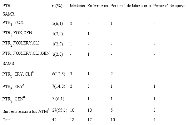 Tabla III. Distribución de los patrones de resistencia antibiótica en las cepas de S. aureus aisladas según ocupación del portador (n=49)