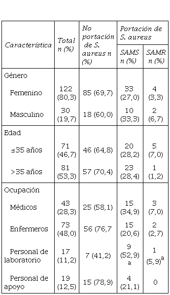 Tabla I. Distribución de portación nasal de S. aureus y cepas resistentes a meticilina según género, edad y ocupación (n=152)
