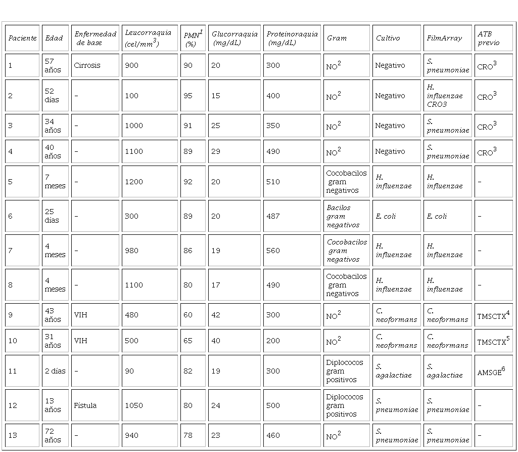 Los microorganismos detectados correspondieron a enterovirus (n=9), S. pneumoniae (n=5), H. influenzae (n=4), varicela-zoster (n=3), HSV-6 (n=3), C. neoformans/gattii (n=2), citomegalovirus (n=2), E. coli K1 (n=1), S. agalactiae (n=1).