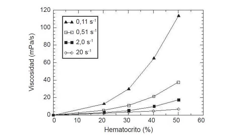 Como se dijo previamente, los GRs afectan la viscosidad. En efecto, se observa una relación de crecimiento exponencial de ésta con el hematocrito (Hto). Para valores del Hto menores del 60%, la viscosidad depende además de la tasa de deformación y su crecimiento es más significativo cuanto más alta es dicha tasa (Fig. 1). Cuando el Hto supera el 60%, se produce una disminución significativa de la perfusión tisular (7).
