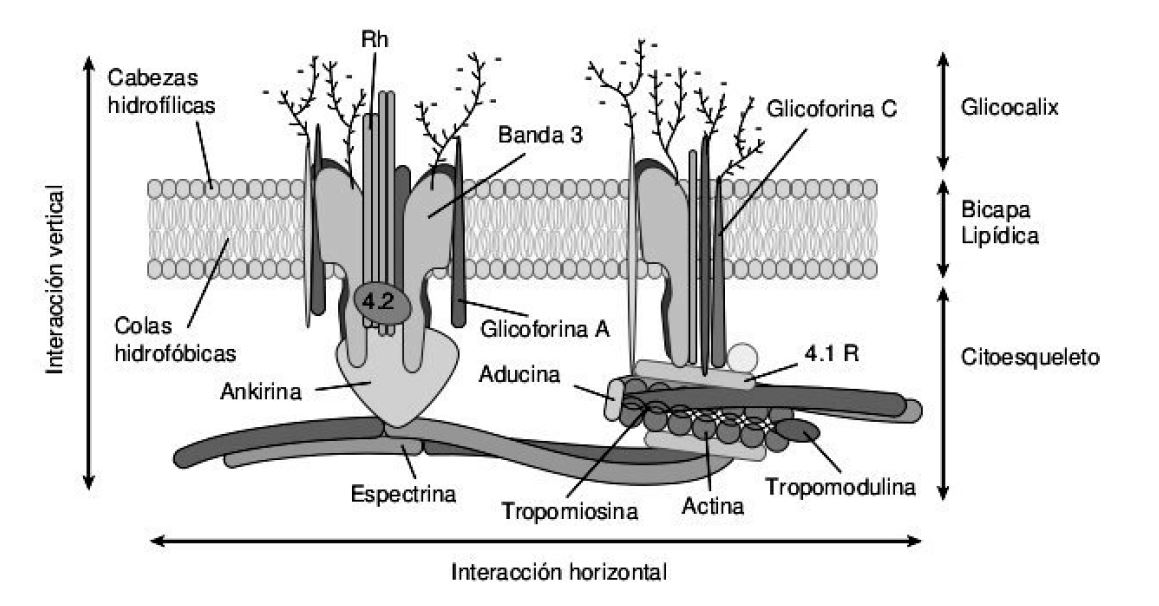 Los trastornos hereditarios que afectan a la membrana eritrocítica incluyen, entre otros, la esferocitosis hereditaria (EsH), la eliptocitosis hereditaria (ElH) y la estomatocitosis. Estos son causados por una deficiencia o disfunción de alguna de las proteínas esqueléticas de la membrana y constituyen un grupo importante de las anemias hemolíticas hereditarias (36) (37). Las dos primeras son las más frecuentes en caucásicos, con una prevalencia aproximada de 1 en 5000. Dos tercios se presentan de forma autosómica dominante; el resto podrían ser de herencia recesiva o mutaciones de novo. Estas enfermedades son el resultado de mutaciones en los genes que codifican las diferentes proteínas ancladas a la bicapa lipídica de la membrana de los eritrocitos. Algunas de estas mutaciones pueden afectar a las proteínas integrales de transmembrana que representan las interacciones verticales (ankirina o proteína 2.1, proteína Banda 3, proteínas 4.1 y 4.2 y glicoforina C) y conducen a la pérdida de cohesión entre la bicapa lipídica y el esqueleto de la membrana (Fig. 2). Por consiguiente, éstas conllevan a la reducción del área de la superficie de la membrana que es típica de la EsH. Otras mutaciones afectan los enlaces horizontales entre los dímeros de espectrina-espectrina y entre la espectrina-actina-proteína 4.1R en el complejo de unión que determinan la integridad mecánica de la membrana. Estos enlaces horizontales defectuosos conducen a una disminución de dicha integridad y a la fragmentación celular que se observa en algunos tipos de ElH (36) (38).