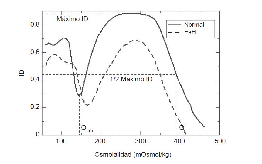 • O’ es la osmolalidad a la cual el ID es igual a la mitad del IDmax. Este parámetro depende de la viscosidad intracelular y, por lo tanto, se relaciona con la concentración hemoglobínica corpuscular media (CHCM).