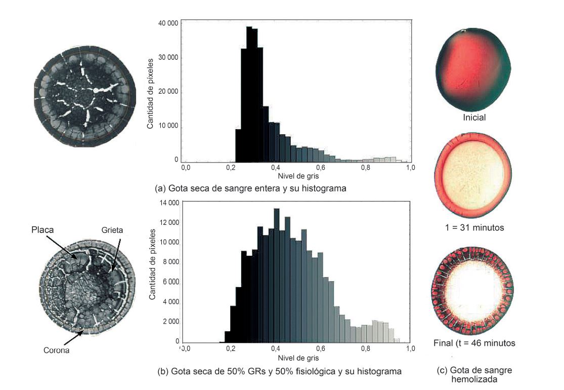 Figura 4. (a) Gota de sangre entera seca y su histograma de grises (1 es blanco). La zona de corona es distintiva y está indicada por círculos.(b) Lo mismo pero para una gota con 50% de GRs y 50% de solución fisiológica. (c) La columna de la derecha muestra la evolución del patrónde secado de una gota de sangre hemolizada. Se ve que el patrón de las coronas y de la zona central difiere para una misma gota y que el secado no da el mismo resultado según la composición y las características de la gota. (Experimentos propios realizados en el laboratorio del IFAS-UNCPBA).