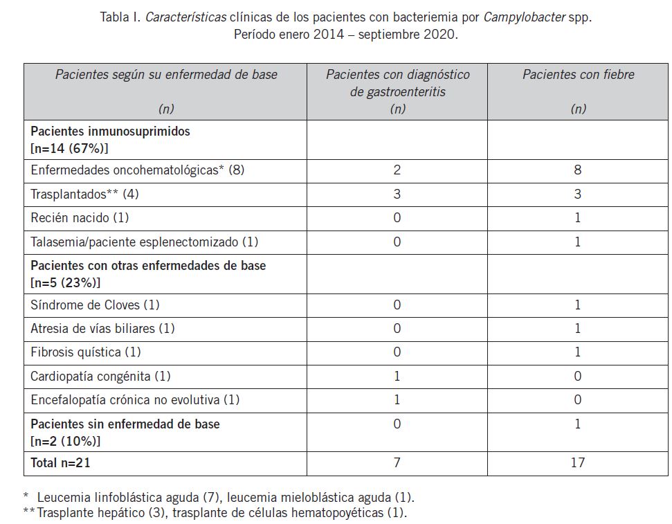 Los pacientes afectados tenían una mediana de 34 meses de edad, 14 (67%) tenían algún tipo de inmunocompromiso, 5 (23%) presentaban otra enfermedad de base y 2 (10%) no tenían comorbilidades al momento del diagnóstico. Siete pacientes (33%) presentaron antecedentes de gastroenteritis y 17 (81%) fiebre con o sin foco conocido. Los datos se detallan en la Tabla I. En 4 de 18 pacientes, en quienes se realizó cultivo de materia fecal, se aisló C. jejuni, al igual que en sus respectivos hemocultivos. Todos los pacientes fueron tratados con meropenem en dosis intravenosa de 60 mg/ kg/ día y completaron 10 días de tratamiento. Veinte pacientes (95%) evolucionaron favorablemente y un paciente (5%), con diagnóstico de leucemia linfoblástica aguda con afectación en el sistema nervioso central, que cursaba su tratamiento quimioterápico en fase de inducción, con 2 series de hemocultivos de control sin desarrollo microbiano, falleció 12 días después de la bacteriemia por C. jejuni.