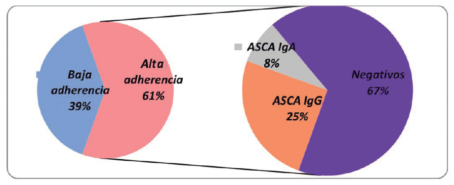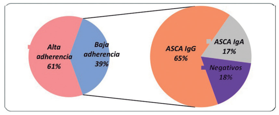 Las prevalencias halladas de ASCA IgA e IgG para los subgrupos de alta y baja adherencia a DLG indican que el isotipo IgG es el hallado con mayor frecuencia en aquellos pacientes con tratamiento inadecuado, encontrándose una prevalencia de ASCA IgG del 65% en el grupo que refiere baja adherencia respecto del grupo de alta adherencia (25%). Esto coincide con la bibliografía consultada, donde se ha reportado una menor prevalencia de este anticuerpo en pacientes que siguen una dieta estricta sin gluten (alta adherencia) respecto de los pacientes no tratados (9,5% vs. 34%) y de los pacientes que no siguen una DLG, en donde su frecuencia alcanza el 52% (14).