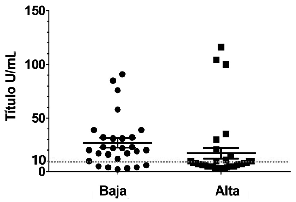 El grupo de pacientes con baja adherencia a DLG presentó una prevalencia de ASCA IgA del 17% (n=4), y de ASCA IgG del 65%(n=15). En cuanto al grupo de pacientes con alta adherencia, éste presentó una prevalencia de ASCA IgA del 8% (n=3) y de ASCA IgG del 25% (n=9) (Figura 1) (Figura 2). Los niveles séricos promedio de ASCA IgG fueron más bajos en pacientes con alta adherencia (14,5±24,5 UI/mL), respecto del grupo con baja adherencia (26±27 UI/mL) (Figura 3) aunque no se observaron diferencias significativas entre ellos (p>0,05; 0,079).