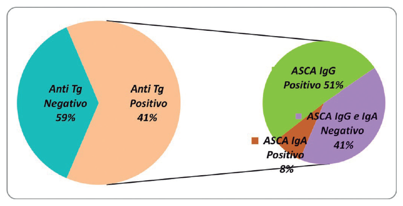 Por otro lado, la prevalencia de ASCA IgG también fue elevada en el grupo de pacientes que presentaron a-Tg positiva (51%). Considerando que es este último un marcador diagnóstico de EC, el hallazgo refuerza el hecho de que existe relación entre la presencia de ASCA y la enfermedad en estudio.