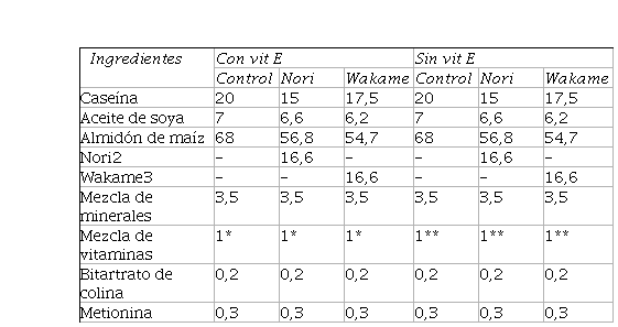Las mezclas de vitaminas utilizadas para las dietas con y sin vit E se prepararon en el laboratorio de acuerdo con las especificaciones de la mezcla AIN-97- VX (14). En el caso de las mezclas sin vit E, se excluyó esta vitamina.