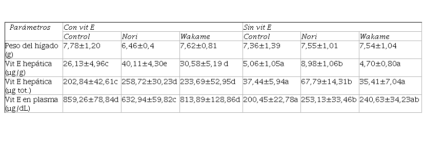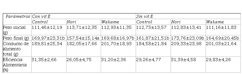 La Tabla II muestra que tanto el consumo de alimento, el peso final de las ratas y la eficiencia alimenticia mostraron un patrón muy similar entre los diferentes grupos a excepción del grupo que consumió Nori con vit E y el grupo control sin vit E, que presentaron valores más bajos. Sin embargo, desde el punto de vista estadístico estas diferencias fueron significativas sólo para el peso final de las ratas. La comparación de medias indicó que sólo el peso final de las ratas que consumieron la dieta que contenía Nori con vit E fue significativamente más bajo que el de los demás grupos.