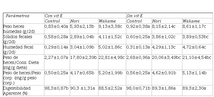 La Tabla III también muestra el efecto de incorporar las algas Nori o Wakame sobre la digestibilidad de la dieta. Se observa que la digestibilidad de las dietas controles que incluían como sus ingredientes principales caseína, almidón y aceite de maíz, fue 98%, mientras que en las dietas con alga, la digestibilidad estuvo en el orden del 90%. Si se considera que la adición de algas a las dietas fue de un 16,6% y que tal como muestra la Figura 1, su contenido de material indigerible es un poco más del 50%, se puede concluir que en las dietas con