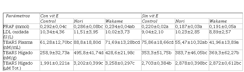 Los resultados de la evaluación de la capacidad antioxidante in vivo de las algas deshidratadas estudiadas, mostró que ni el alga Nori ni el Wakame redujeron el estrés oxidativo en el hígado y protegieron solo parcialmente en el plasma de las ratas que consumieron dietas deficientes en vit E. Así, por ejemplo, la capacidad del plasma para reducir el hierro férrico (FRAP), disminuyó en los tres grupos de ratas que consumieron las dietas sin vit E y esto ocurrió tanto en las ratas asignadas a las dietas con algas, como en las sin alga, indicando que en estas ratas, el consumo de las algas no mejoró la capacidad reductora del plasma.