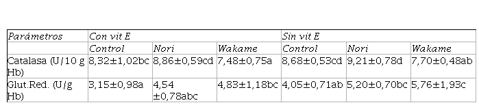 La Tabla VI muestra las actividades de las enzimas antioxidantes catalasa y glutatión reductasa medidas en hemolizados de glóbulos rojos de los 6 grupos de ratas estudiados. En la tabla se observa que en general la actividad de ninguna de estas enzimas varió sustancialmente entre los grupos. Así, en el caso de la catalasa el análisis estadístico no detectó un efecto significativo para la vit E, indicando que los 3 grupos con vit E tenían actividades de catalasa similares que los sin vit E. Sin embargo, la tabla señala que las actividades más altas estuvieron asociadas al consumo de Nori y las más bajas al de Wakame, tanto en los grupos con vit E, como sin vit E. En el caso de la glutatión reductasa, los 3 grupos sin vit E tuvieron actividades ligeramente mayores que los 3 con vit E y que los grupos con alga tuvieron actividades mayores que los sin alga. Esto indica que tanto la deficiencia de vit E como la presencia de algas resultó en una ligera inducción de la actividad de esta enzima eritrocitaria.