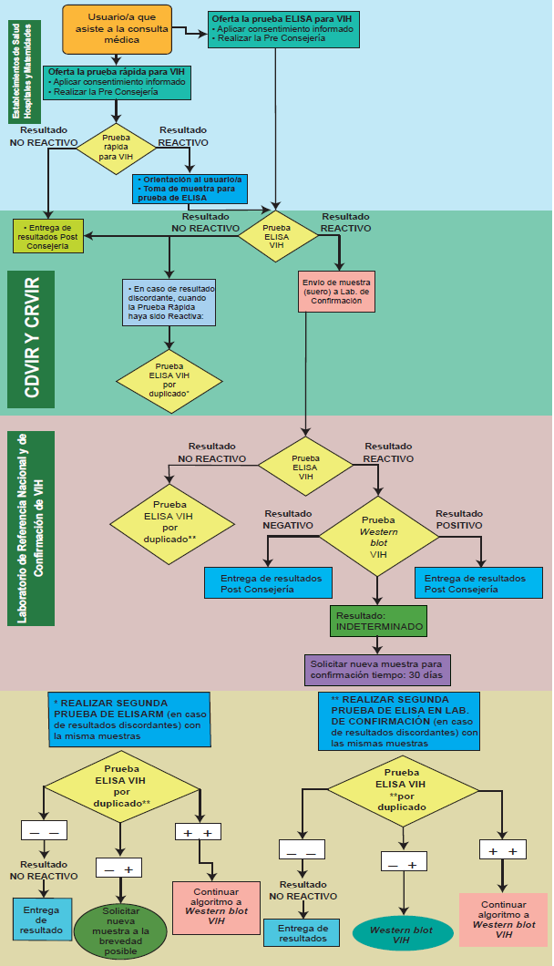 Prueba 2 confirmatoria. Prueba ELISA Ag/Ac de desempate. Conforme a la ley Nº 2729, la prueba para VIH debe ser con consejería y consentimiento informado, excepto en los casos descritos en dicha ley (10).
