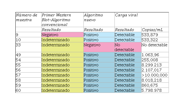 Se determinó la carga viral a 10 muestras indeterminadas con el primer WB: en 9/10 se detectó ARN viral y 1/10 fue no detectable. En la única muestra con resultado discordante entre ambos algoritmos (Negativo con AC y Positivo con AN) se detectó ARN viral. Los resultados finales del AN para estas 11 muestras fueron los mismos a los reportados por carga viral (Tabla I).