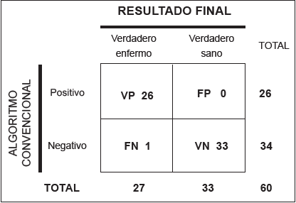 Se determinó el número de pacientes verdaderos enfermos y verdaderos sanos (resultados finales); se consideró verdadero enfermo cuando la muestra fue positiva con ambos algoritmos y verdadero sano cuando la muestra fue negativa con ambos algoritmos; para la muestra discordante se consideró el resultado de carga viral. Se registraron un total de 27/60 verdaderos enfermos y 33/60 verdaderos sanos. Con estos datos se realizaron las tablas de contingencia 2x2 entre los resultados finales y ambos algoritmos (Tabla II)(Tabla III).