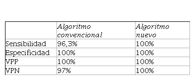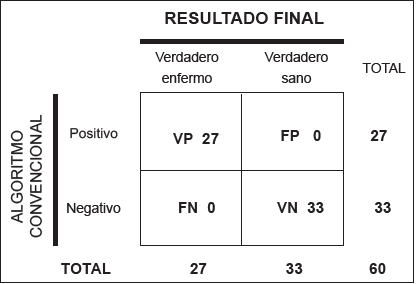 El AC reportó una especificidad y valor predictivo positivo del 100%, sin embargo, su sensibilidad y valor predictivo negativo fueron del 96,3 y 97%, respectivamente. El AN reportó una sensibilidad, especificidad, valor predictivo positivo y negativo del 100% (Tabla IV). El índice Kappa entre al AC y AN fue de 0,966 que, de acuerdo a la escala de valoración de este índice, indica una concordancia “muy buena” (17) entre resultados de ambos algoritmos. Chi-cuadrado de Pearson fue 56,078 con .<0,01.