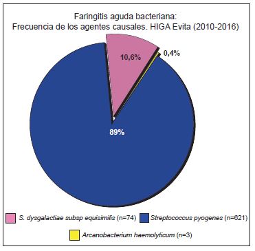 En el período de estudio de procesaron 3.246 muestras de fauces; en 698 de ellas se diagnosticó faringitis aguda bacteriana (21,5%). La distribución porcentual de las especies aisladas en todo el período fue (n): EBA: 89% (621) Streptococcus dysgalactiae subsp. equisimilis: 10,6% (74) y Arcanobacterium haemolyticum:0,4% (3). Los datos se describen en la Figura 1.