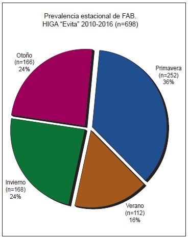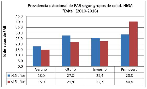 En relación a la estacionalidad, el número de FAB fue mayor en primavera (.<0,05) y predominó en los pacientes pediátricos. Este dato difiere de lo referido en algunos trabajos que señalan un aumento en la incidencia tanto en invierno como en primavera (14)(17).