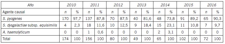 Presentó particular interés el aumento de casos de FAB por estreptococos no grupo A en dos momentos del período de estudio. S. dysgalactiae subsp. Equisimilis resultó ser el segundo agente de FAB y representó el 10,6% del total.