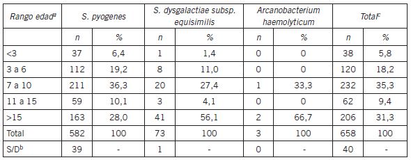 Considerando el rango de edades y el agente causal, el 36,3% de las faringitis por EBA se presentó en el grupo de niños de 7 a 10 años (.<0,05; Xi2=2,1; OR=1,48 [0,87-2,53]); el 56,2% de las FAB causadas por S. dysgalactiae subsp. equisimilis se diagnosticó en mayores de 15 años (.=0,0001; .i2=23,5; OR=2,26 [1,98-5,35]) (Tabla II).