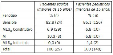 La resistencia a ERY resultó del 16,6% y no presentó diferencias entre los pacientes mayores y menores de 15 años (.>0,05). Este porcentaje es superior a los informados por la Red Whonet, (1,2%), por la red Red Latinoamericana de Vigilancia de la Resistencia a los Antimicrobianos (ReLAVRA [2%]) y por fuentes consultadas en la literatura (17).
