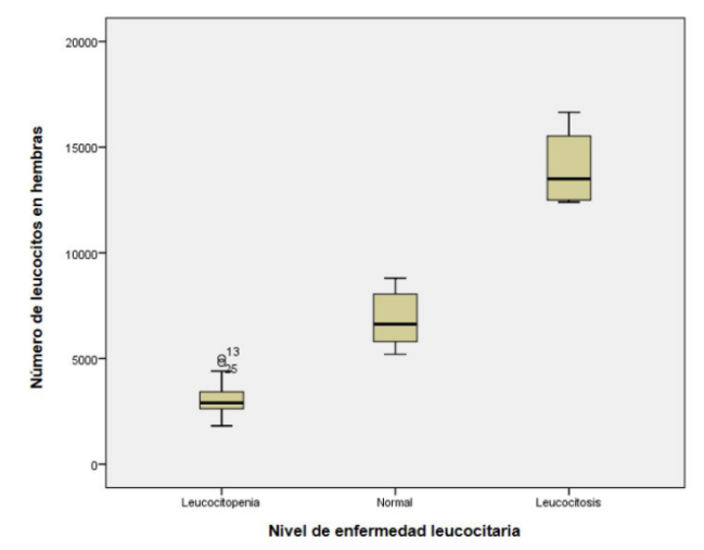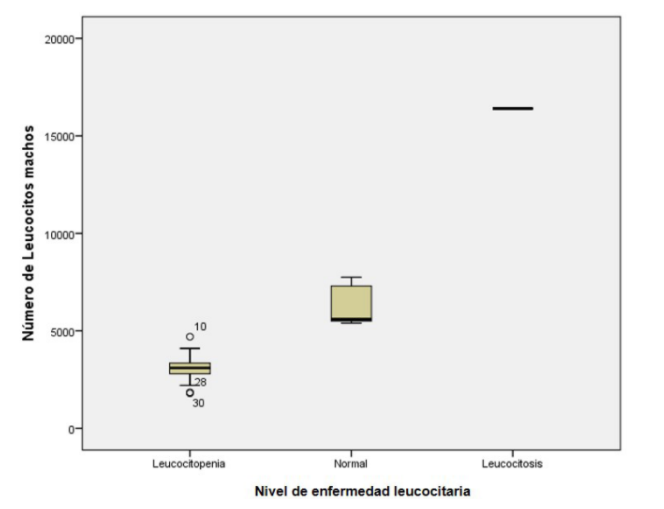 La Tabla I presenta el recuento de leucocitos en ratones macho utilizados en la experimentación, mostrando el número de animales que presentó alteraciones o normalidad en los valores de leucocitos. El grupo control presentó entre 5000 y 12000 leucocitos/mm3, valores reportados como normales en estudios realizados en ratas (16). La Figura 1, correspondiente a los resultados de la prueba ANOVA, permitió evidenciar que hay diferencia de medias en el recuento celular (número de leucocitos) debido a los tratamientos, y estas diferencias son significativas.