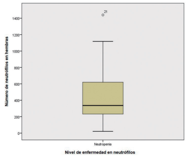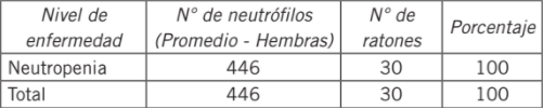En la Tabla V se presenta el recuento de neutrófilos en ratones hembra utilizados en la experimentación. No aplica ANOVA debido a que hay menos de dos grupos por variable dependiente, es decir número de neutrófilos en ratones hembra (Fig. 5).