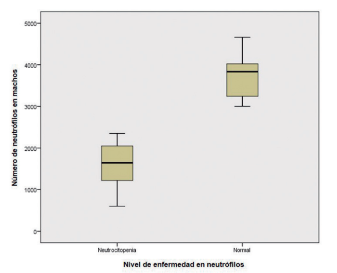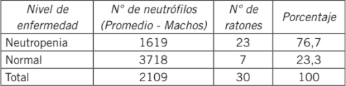 La Tabla II muestra el recuento de neutrófilos en ratones macho utilizados en la experimentación, destacando la neutropenia como una alteración derivada del tratamiento. Por su parte, en la Figura 2 se evidencia que hay diferencia de medias en el recuento celular (número de neutrófilos) debido a los tratamientos y éstas son significativas.