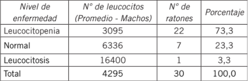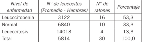 Se evidencian estados de leucopenia (Tabla I) en el 88% de ratones que fueron expuestos a perclorato de amonio. Adicionalmente, se observó una disminución de peso, en especial después de la segunda semana de tratamiento, y más evidente en los ma chos que en las hembras, en las que la leucopenia se presentó en un 64% de los individuos expuestos a perclorato (Tabla IV). Los grupos control negativo presentaron niveles normales de leucocitos.