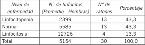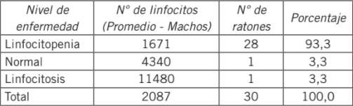 Los machos presentaron alteraciones en el recuento celular de la línea blanca en mayor porcentaje que las hembras, en especial linfopenia. Veintiocho ratones macho utilizados en el experimento mostraron esta alteración celular, de los cuales 25 fueron expuestos a perclorato de amonio, los tres restantes pudieron presentar esta alteración secundaria a la manipulación experimental (Tabla III).