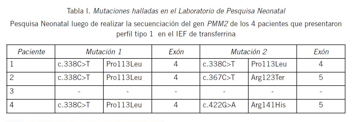 Se realizó la secuenciación del gen PMM2 a las 4 muestras con perfil tipo I encontrándose, en 3 de éstas, mutaciones patogénicas conocidas en ambos alelos (Tabla I). En el caso de homocigosis (Pro113Leu) las únicas manifestaciones clínicas observadas fueron retrasos del desarrollo, mientras que los otros dos casos caracterizados presentaban, además, hipotonía.